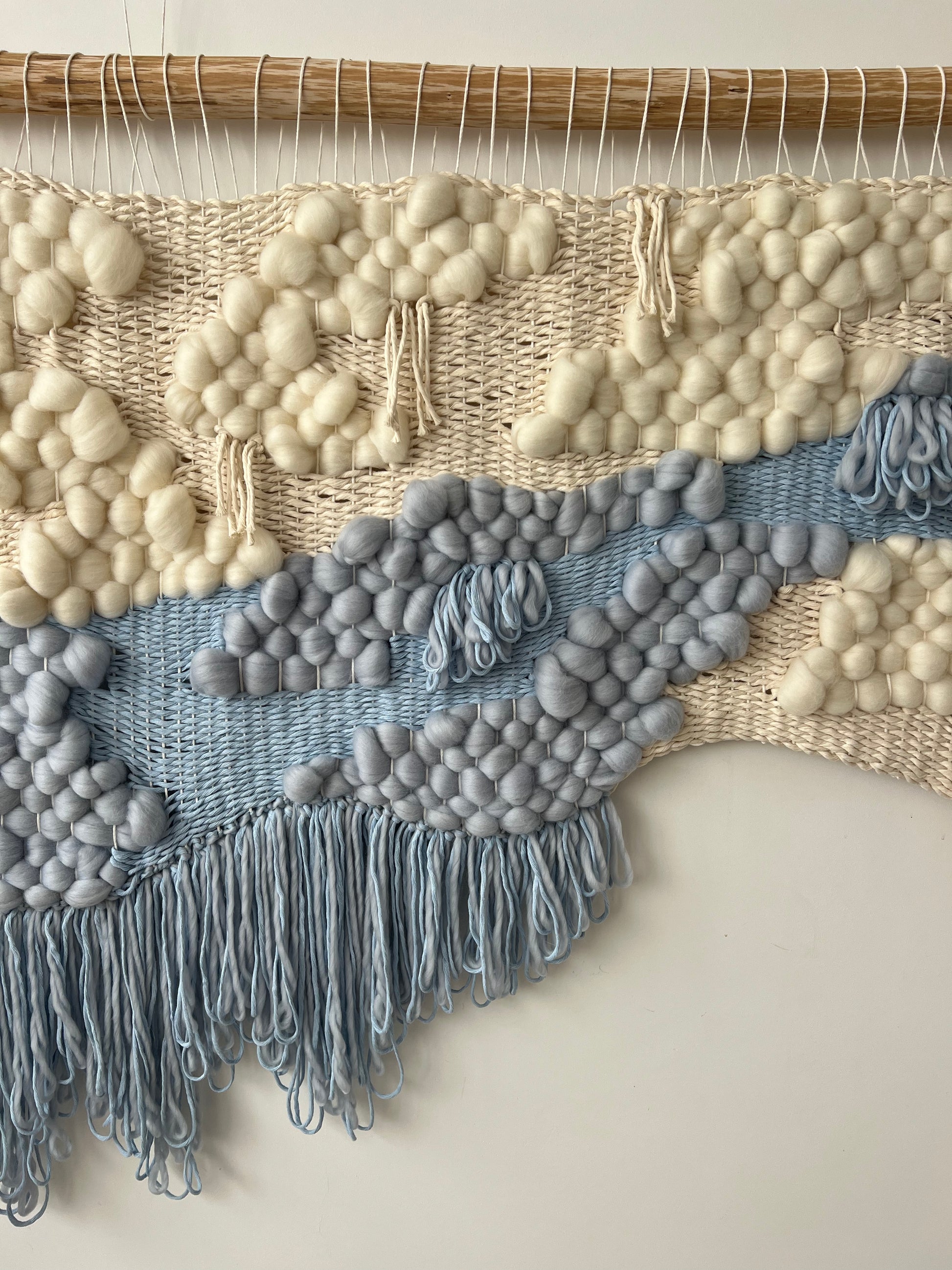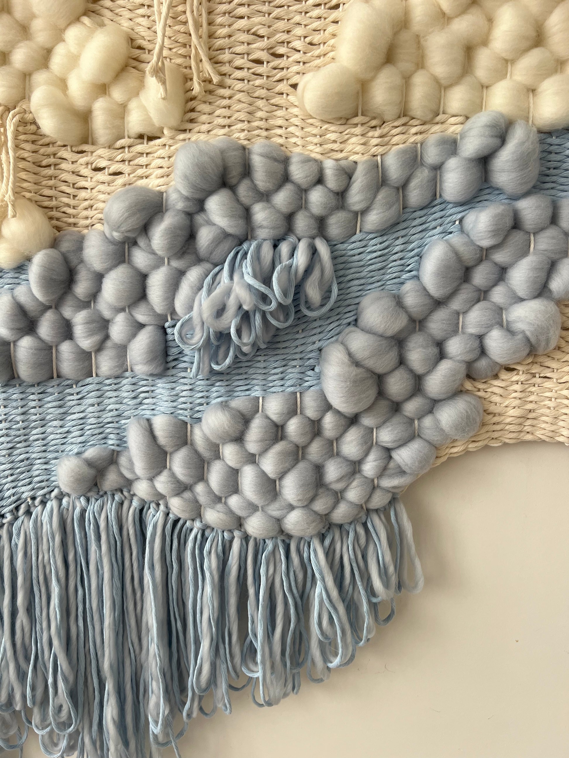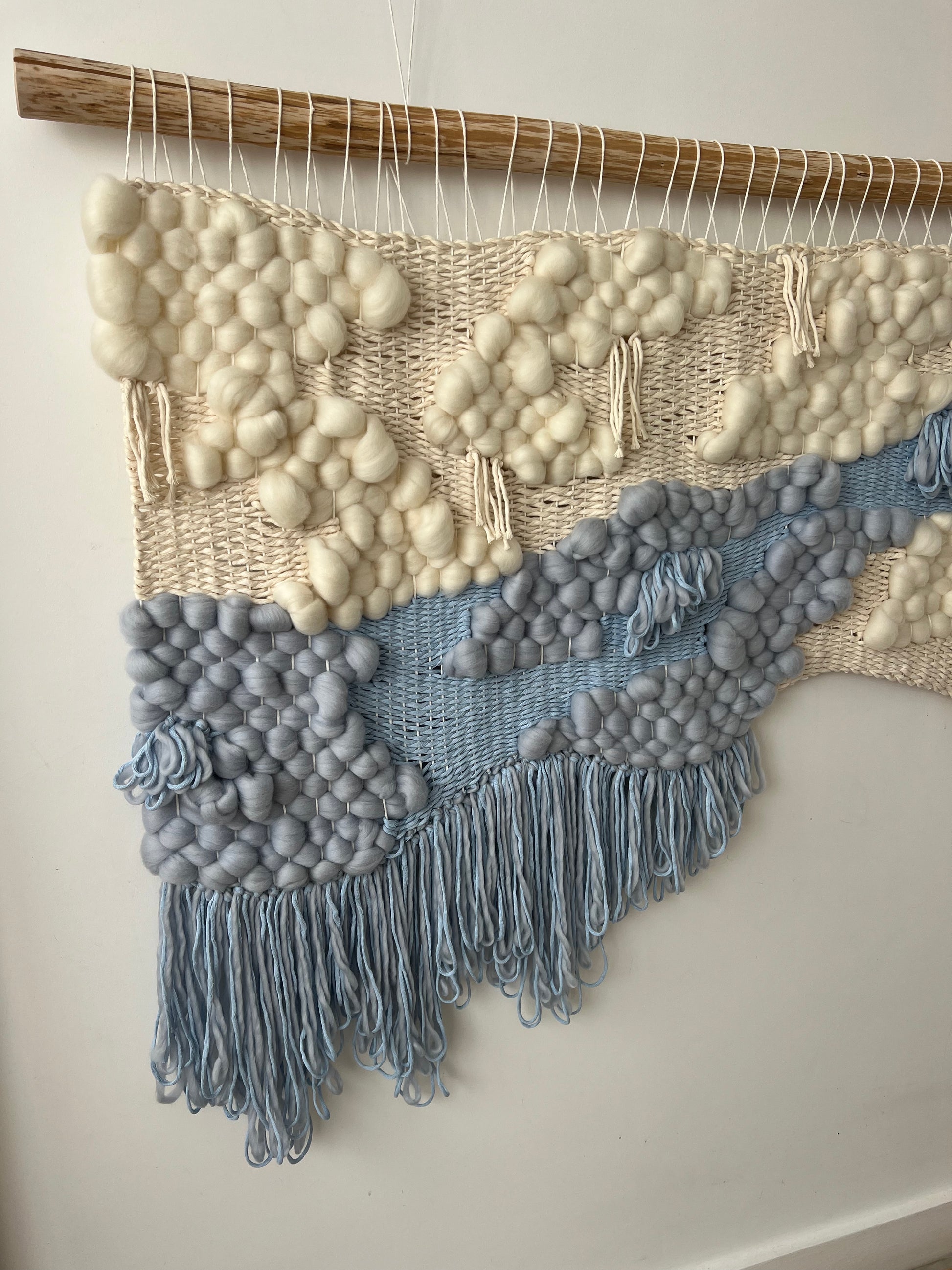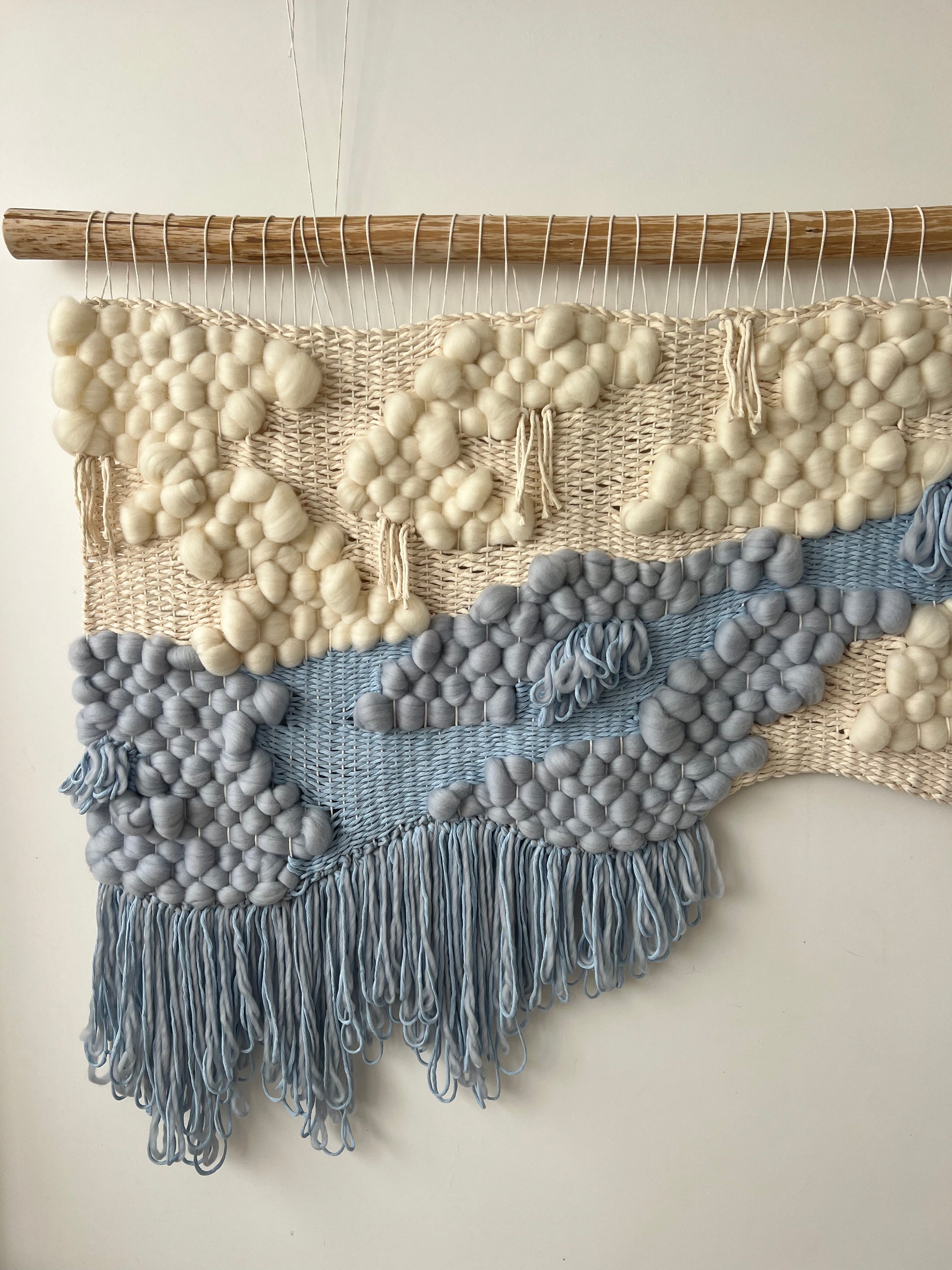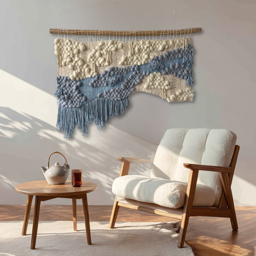Soft and ethereal, this handwoven wall hanging captures the harmony of air and water in motion. Crafted from natural wool and cotton fibers, it flows in gentle waves of cream and misty blue, evoking drifting clouds and flowing rivers. The tactile texture of rounded wool forms and airy weaving gives the piece a sculptural, almost floating presence — a quiet reminder of calm, balance, and connection with nature.