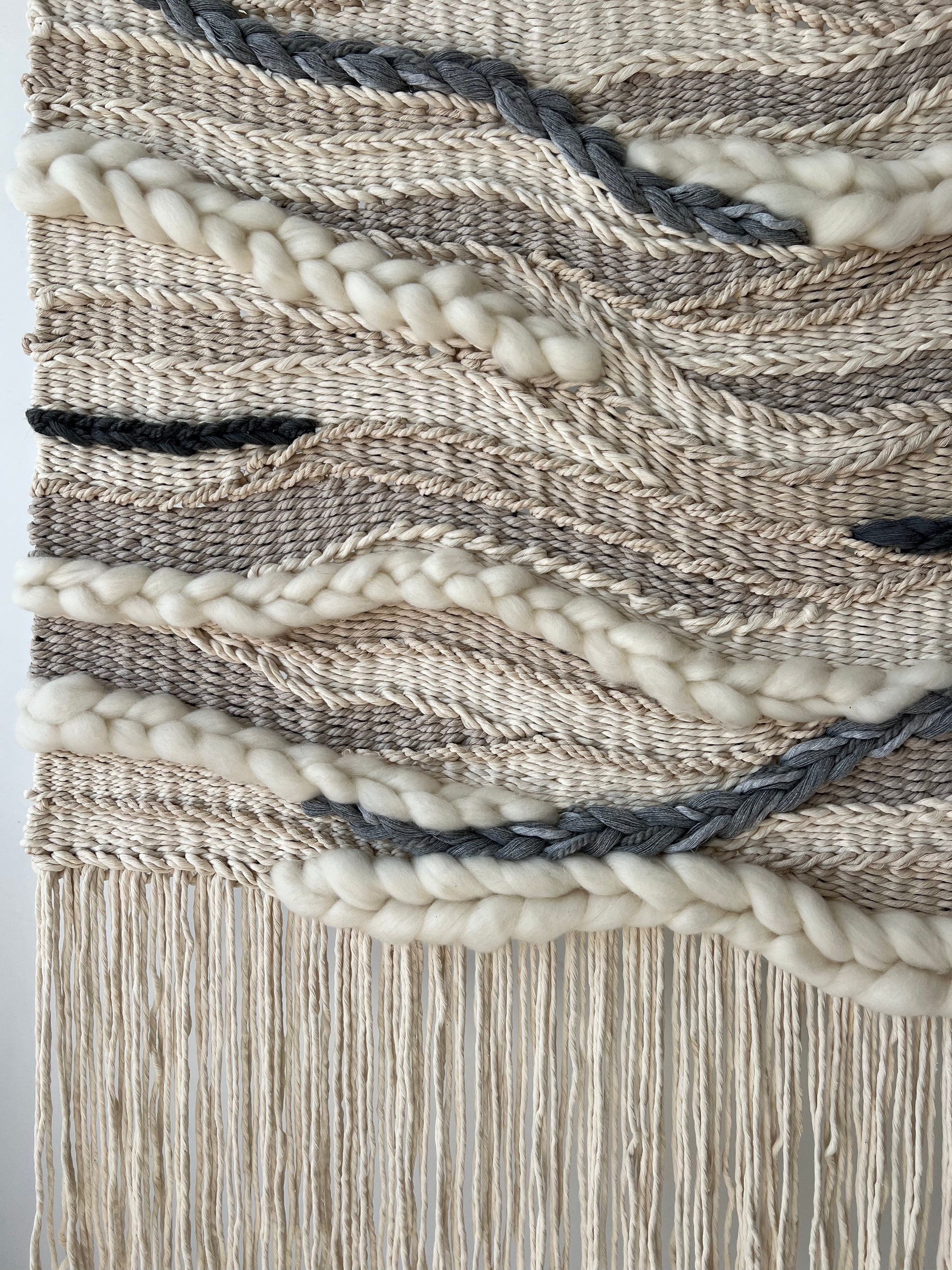 Soft ivory, cool beige, and warm grey tones intertwine with deep charcoal braids, creating an organic rhythm and soothing texture. Each fiber — from chunky wool to twisted cotton — has been thoughtfully chosen to add depth, warmth, and tactile contrast.